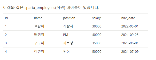 - sparta_employees 테이블에서 모든 직원의 이름(name)과 직급(position)을 선택하는 쿼리를 작성해주세요.